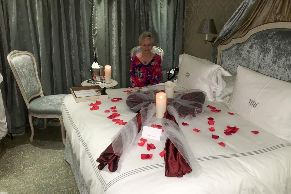After dinner, en route to the main lounge we stopped by our stateroom and this is what we found! Candles, a great big ribbon, rose petals artfully strewn and a bottle of champagne! We took some pics, grabbed the bottle of champagne and off to the lounge to share.