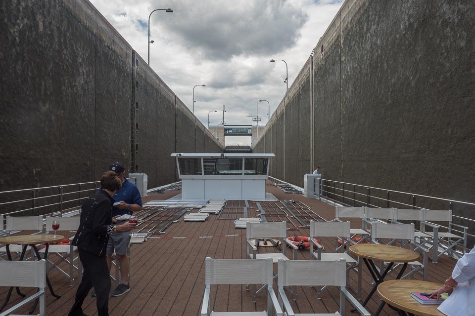 I was astonished when I learned the crew size. There is considerable staff in hotel services, food and beverages and tour services. All totaled, there were 51 crew members on board. But how many actually comprise the boat's crew, operating it and getting it from A to B? Of those 51, only 8! There are two captains. One is in the pilot house when the boat is underway and he is the only one in the pilot house. There are three deck hands handling the lines when we pass through locks and when the ship is being moored. There are three engineers who are ensuring all of the equipment is functioning properly. But they are not standing watch in the engine room; no one is in the engine room when the boat is underway. The captain can monitor it all via repeater gauges and TV screens.