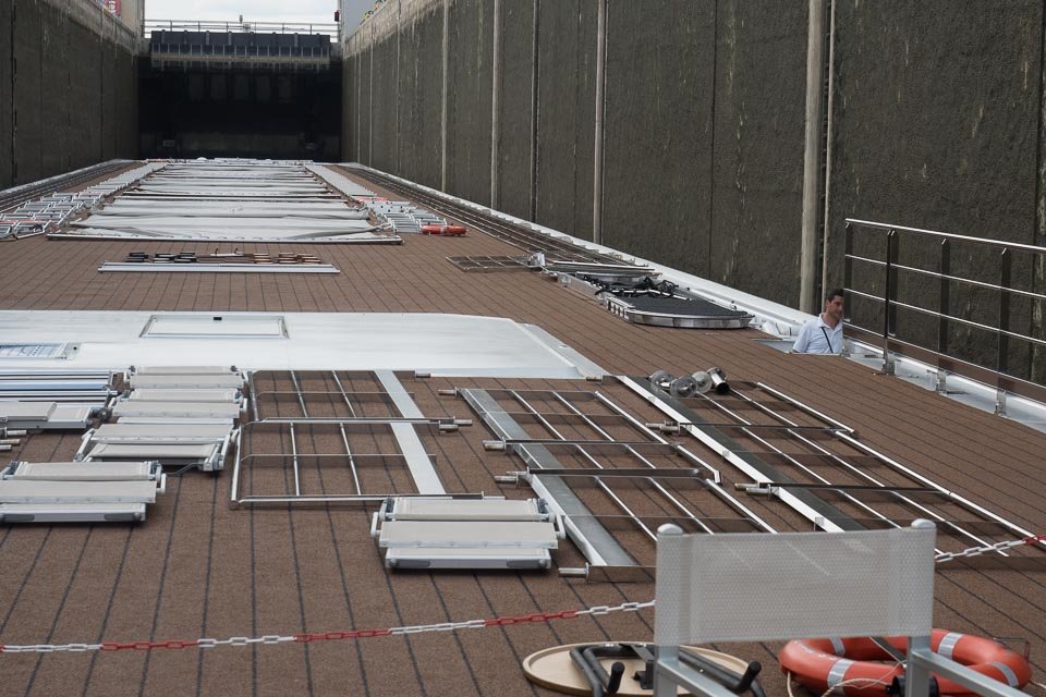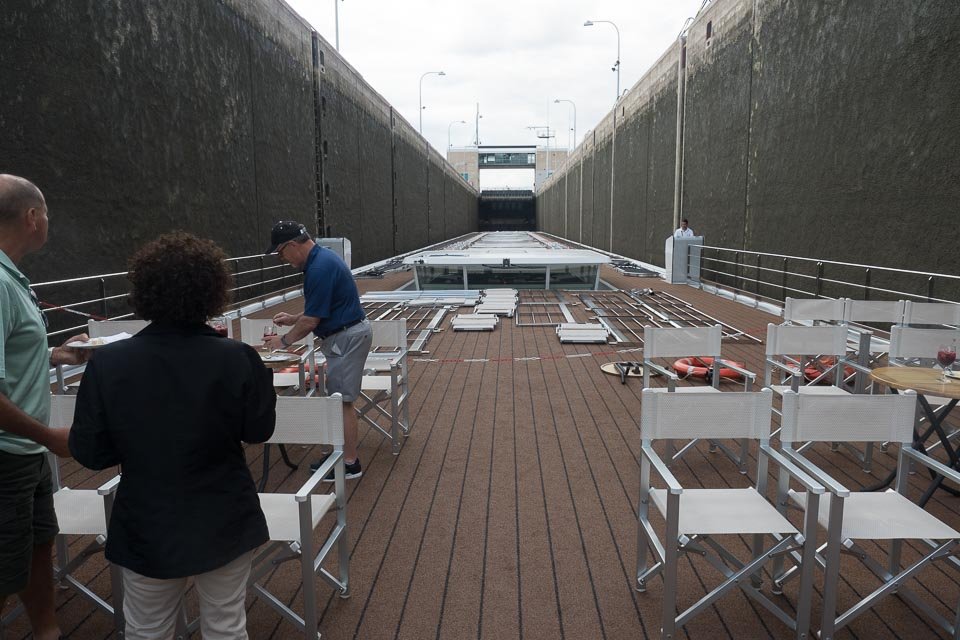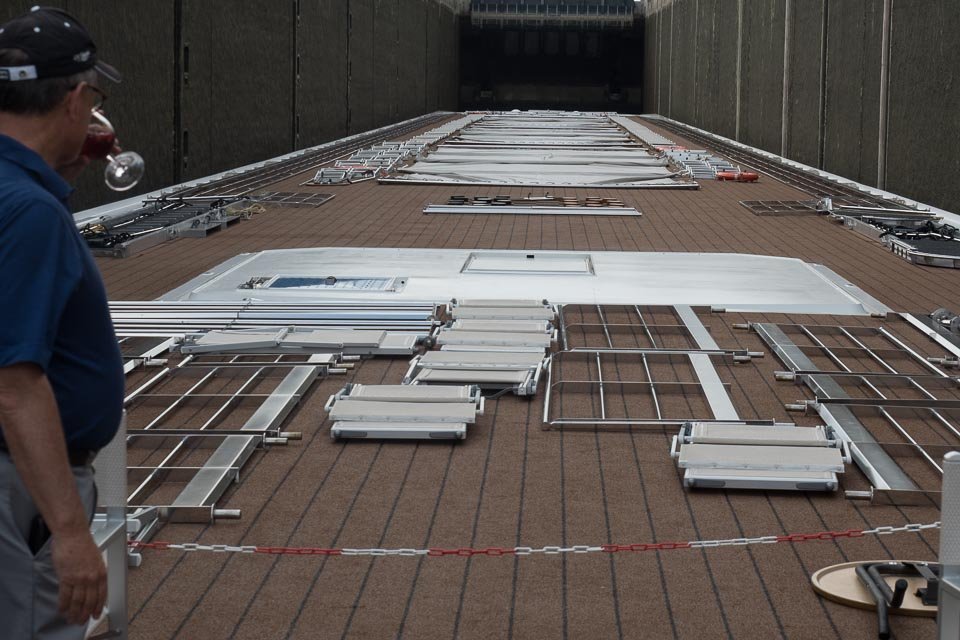 You are looking aft, from the front of the top deck towards the rear. We had just entered one of the locks and the captain graciously agreed to demonstrate how the pilot house is retracted. This is the normal configuration. The pilot house is in the middle with an auxiliary control station on each side. Those are used in the locks and when mooring. Note that most of the deck hardware has already been collapsed. The railings were up only where we passengers were permitted to go at that particular time.
