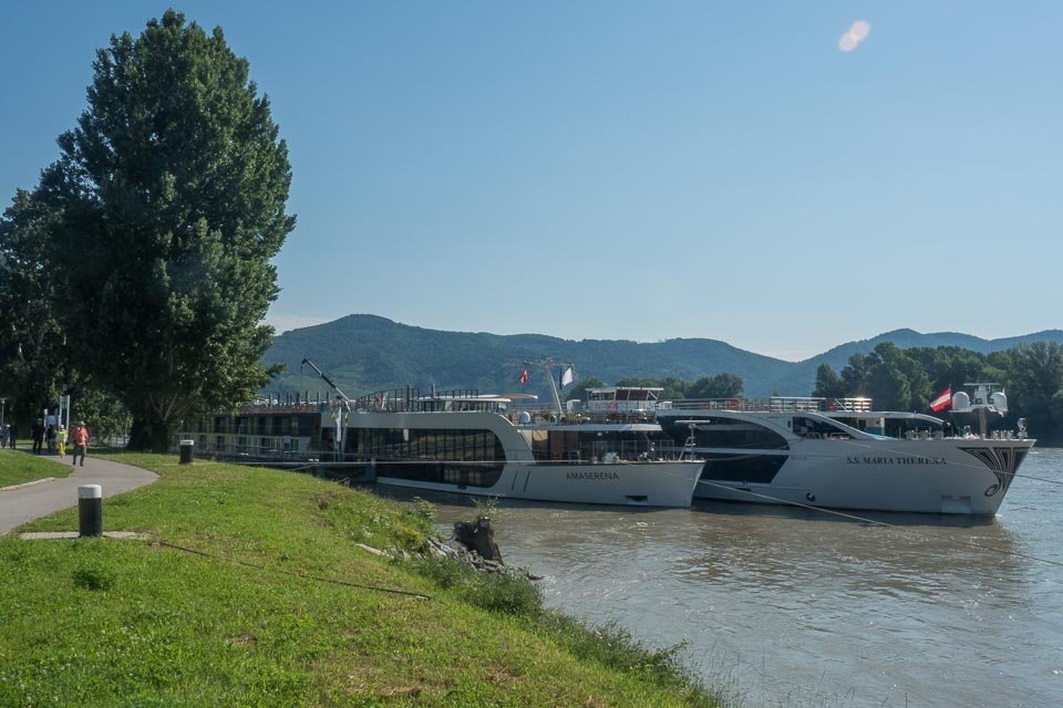 It was typical for river boats to tie up alongside each other. There just aren't enough docking spaces to accommodate them individually. We are tied up outboard of an Ama ship. Usually in order to cross the inboard ship, you had to go up to your ship's top deck, walk across the other ship's top deck and then down and off. A bit awkward, but necessary for security reasons.