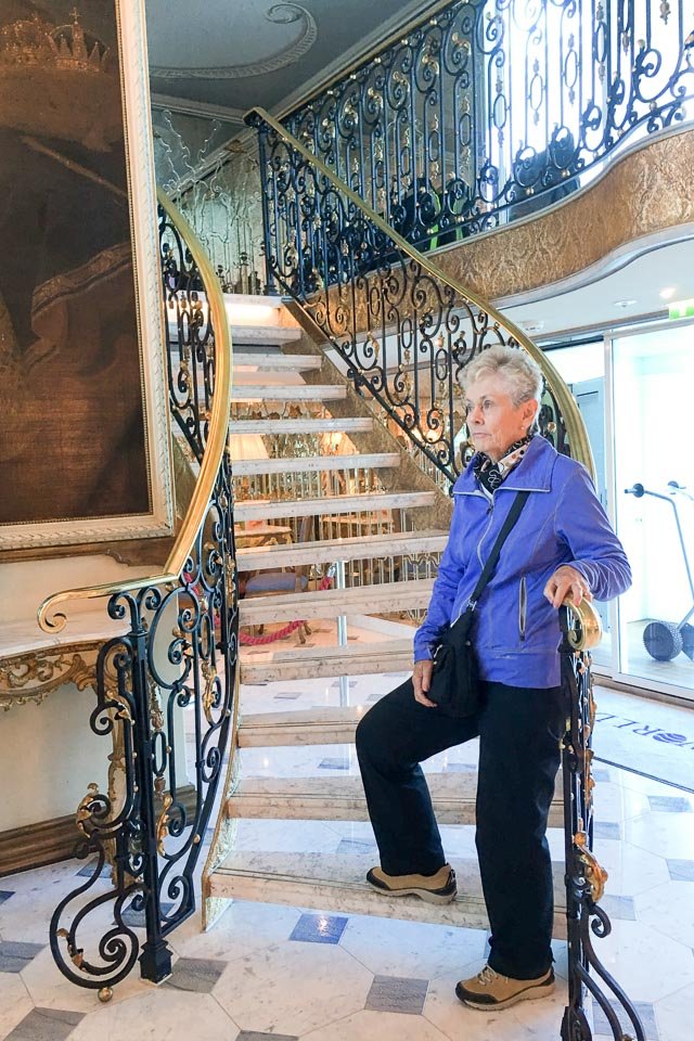 The grand stairway leading up from the main level where our stateroom was located as well as the dining room.